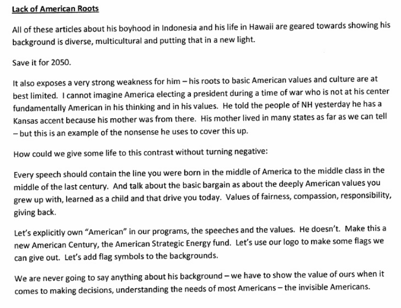 The Sept. 15 Trump campaign statement linked to a 2007 strategy memo published in the Atlantic from former Clinton aide Mark Penn that advises pointing out Obama’s "lack of American roots."