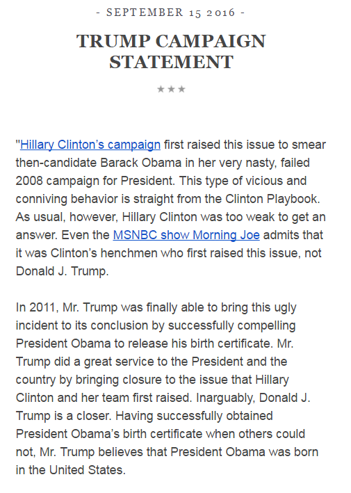 This prompted a flurry of incredulity over his revitalization of the "birther" issue, which in turn prompted his campaign to answer the question for him and also accuse Clinton of starting it in the first place.